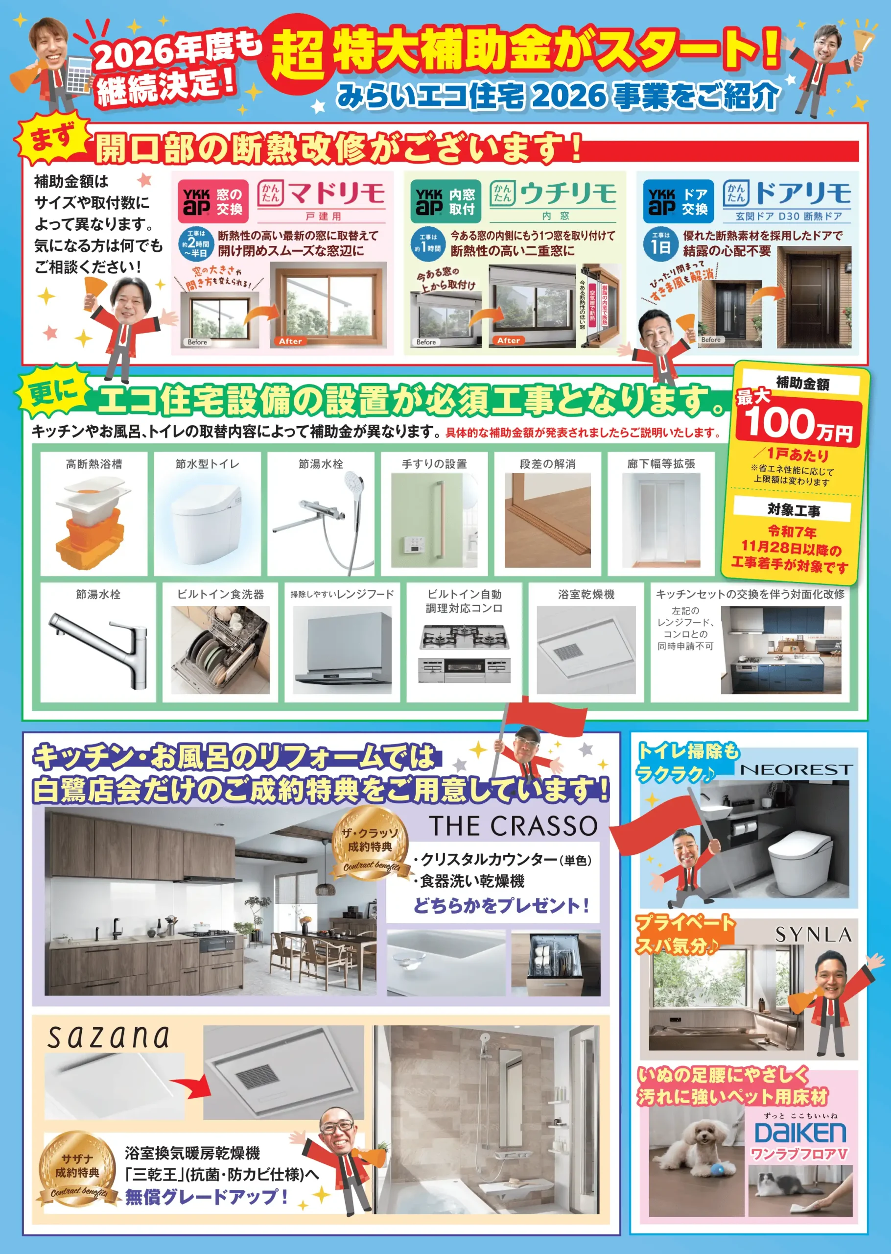 「みらいエコ住宅2026事業」により、窓の断熱改修やエコ住宅設備の設置などで、1戸あたり最大100万円の補助金が受けられるチャンスです。 補助金の対象となる工事や条件について、会場で詳しくご説明いたします。