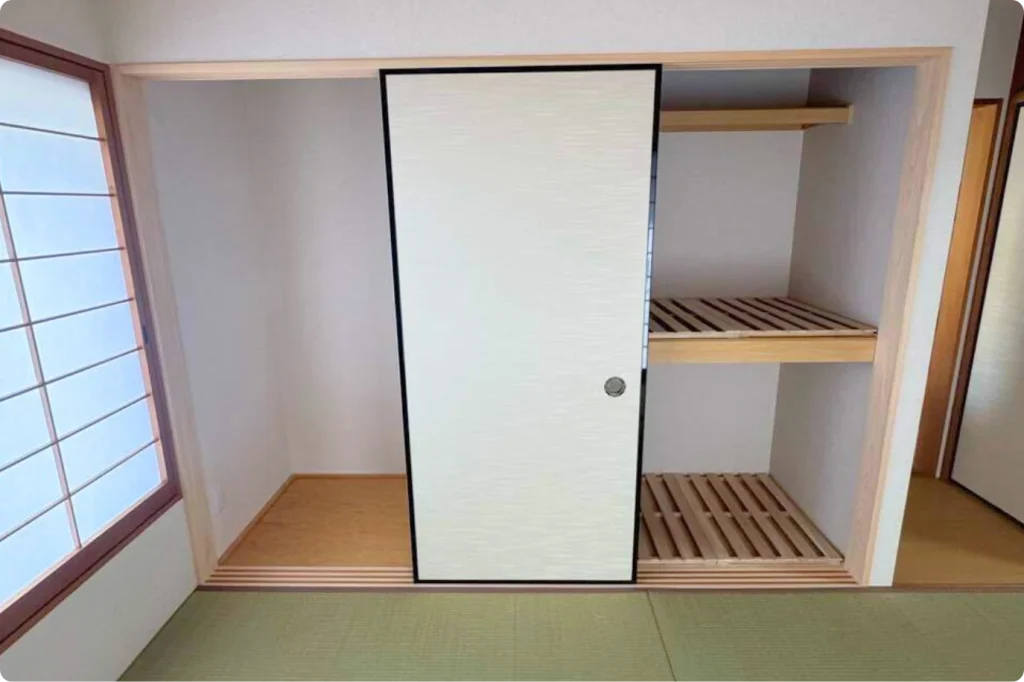 床の間を仏間へとつくり替え、幅を三分の一に調整。残りのスペースを広い収納として活用できるようにし、3枚引き戸の襖で美しく隠れる仕様に整えました。畳は熊本県産の上質ない草に表替えし、香りと質感の良さが際立つ空間に。既存の仕切り襖と雰囲気の近い柄を選ばれたことで、和室全体に統一感が生まれ、まるで旅館のように落ち着いた雰囲気に仕上がっています。