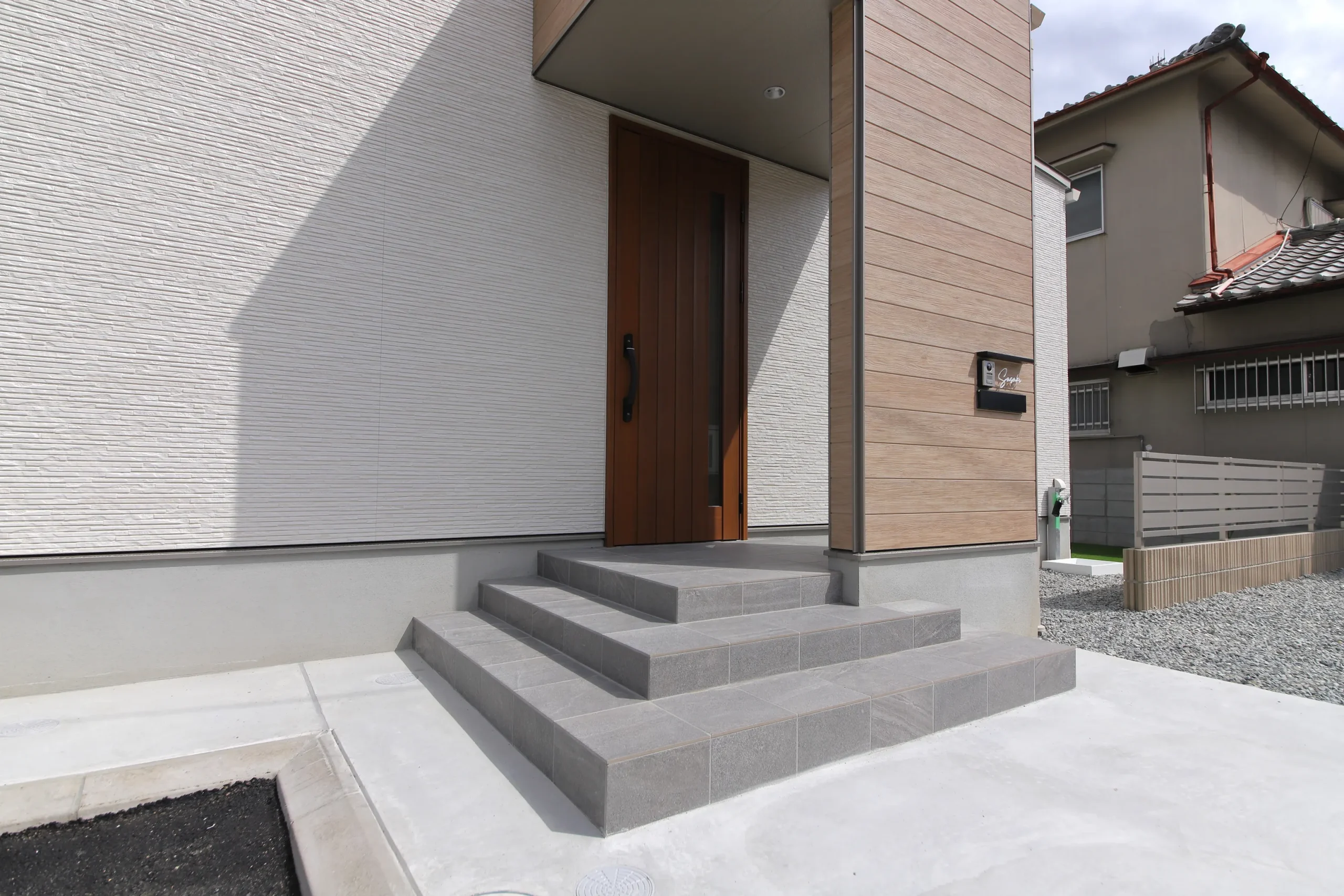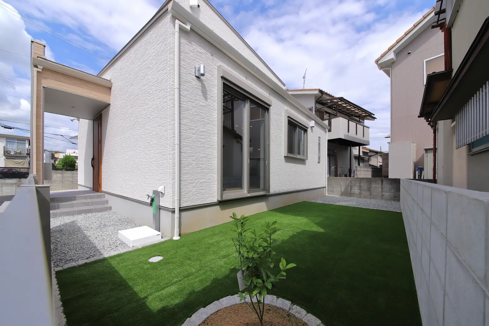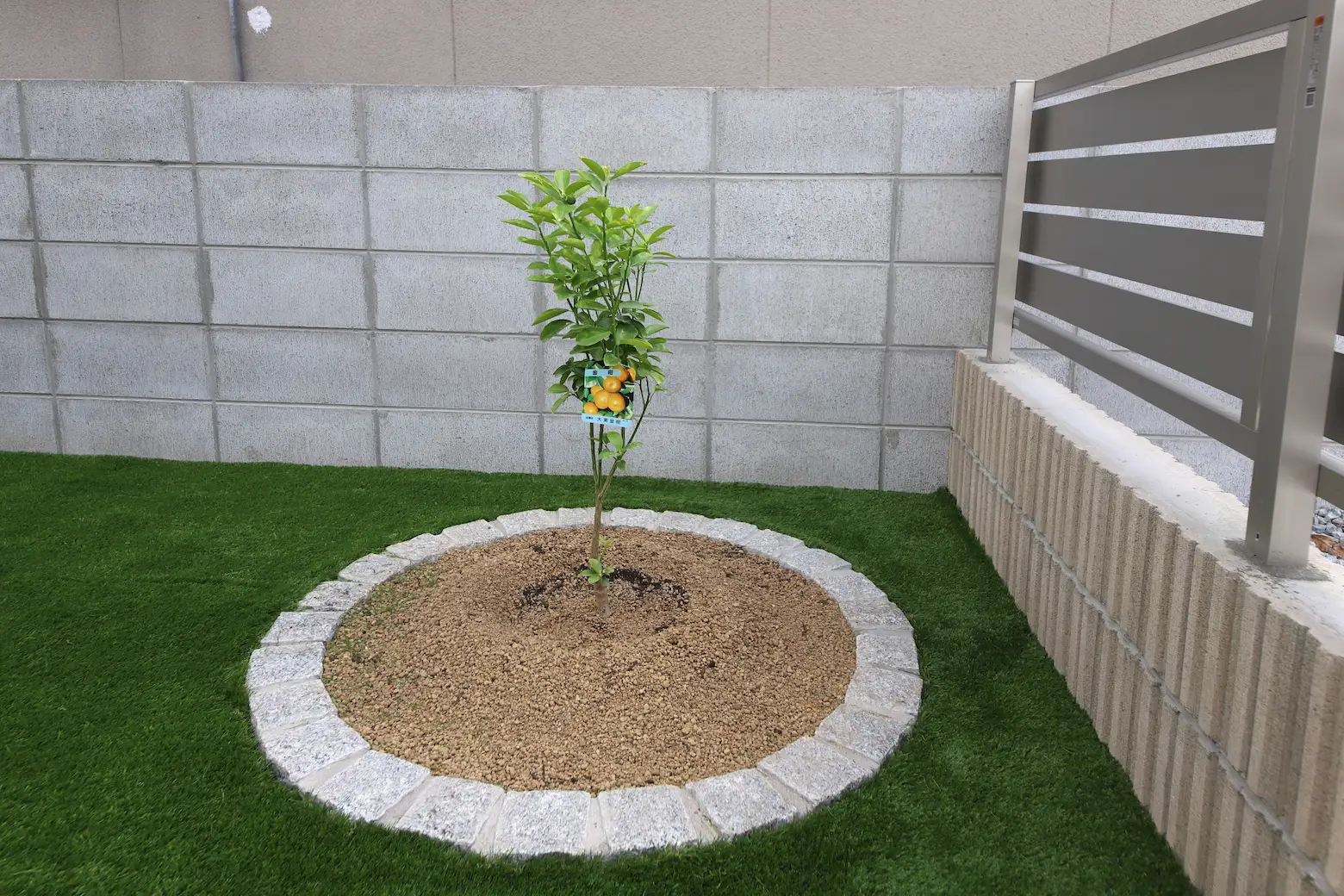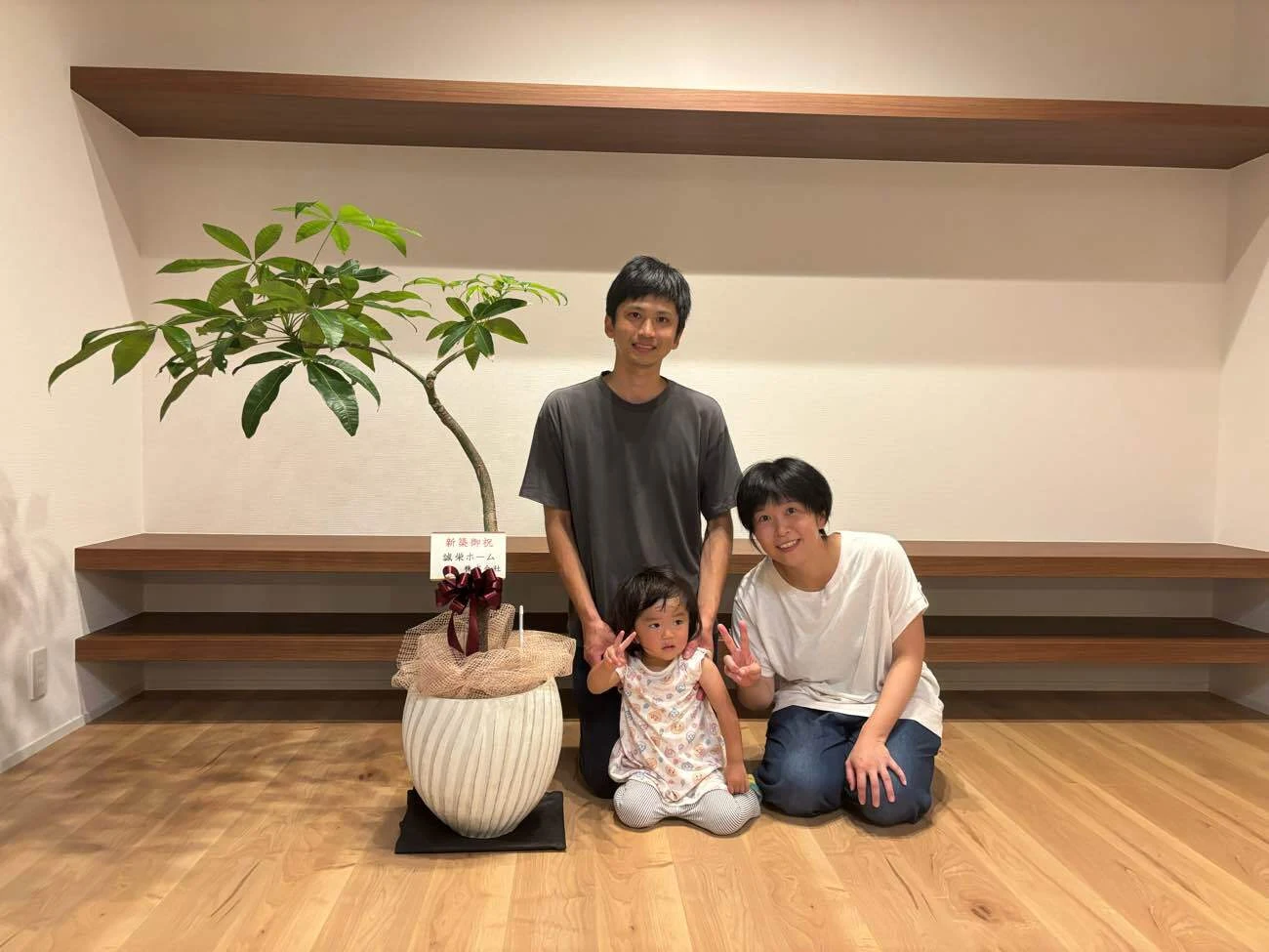 外構では、人工芝の遊び場や安全に配慮した柵、カーポートを設け、家の外でも安心して過ごせる環境に。娘さんのお名前にちなんだ金柑の苗木も植えられ、住まいとともに成長していく姿が楽しみです。