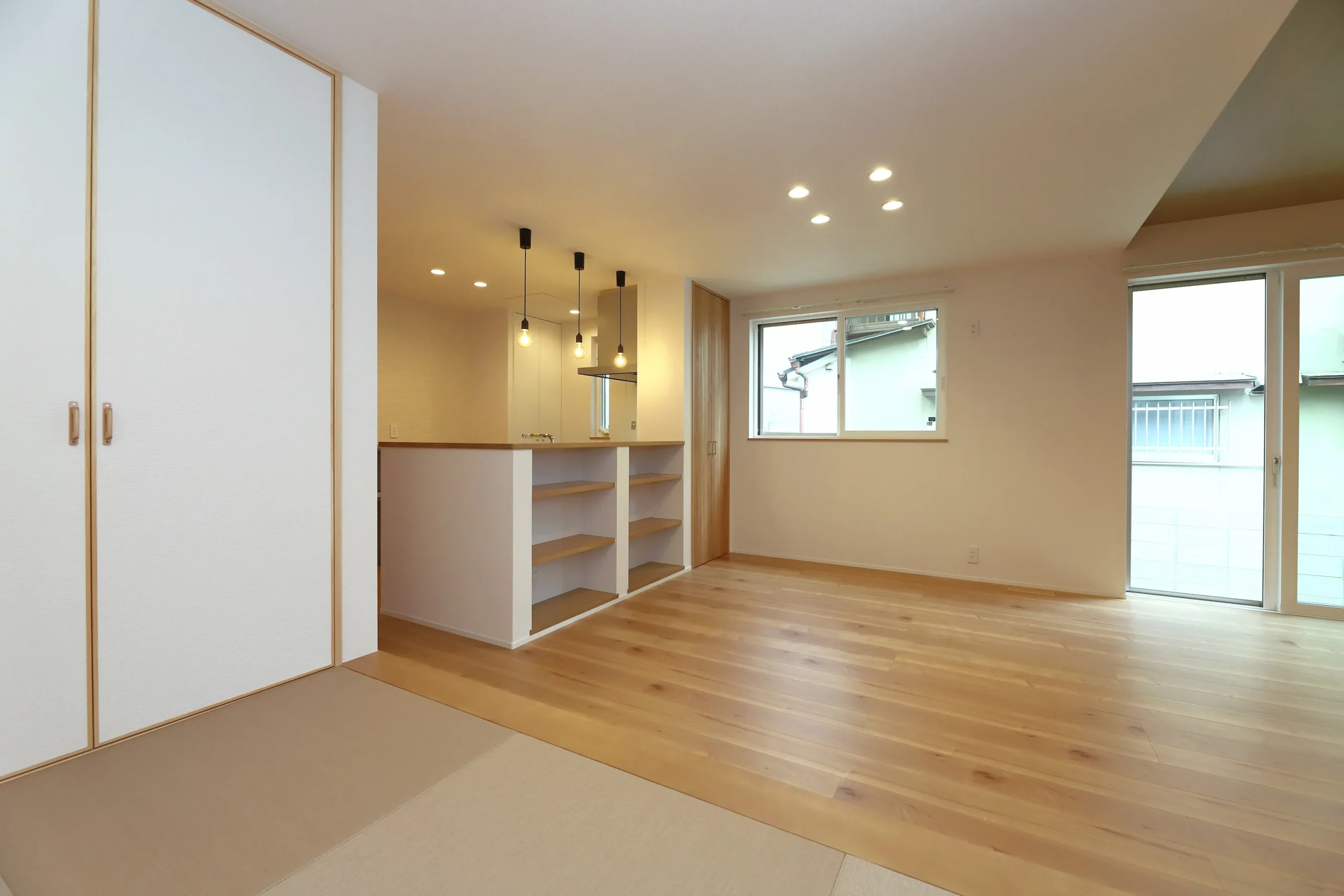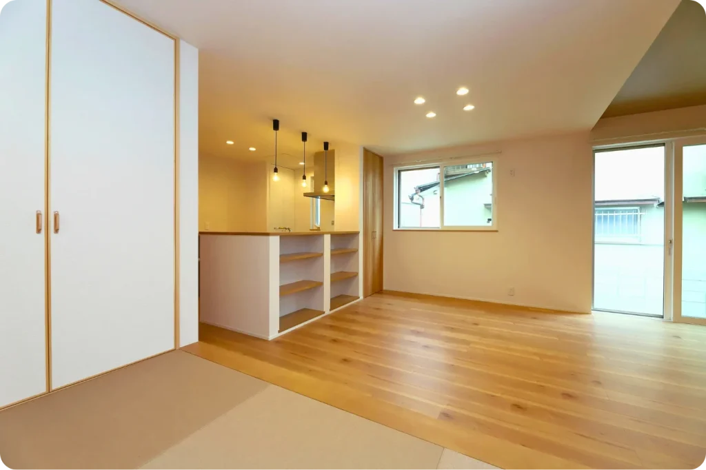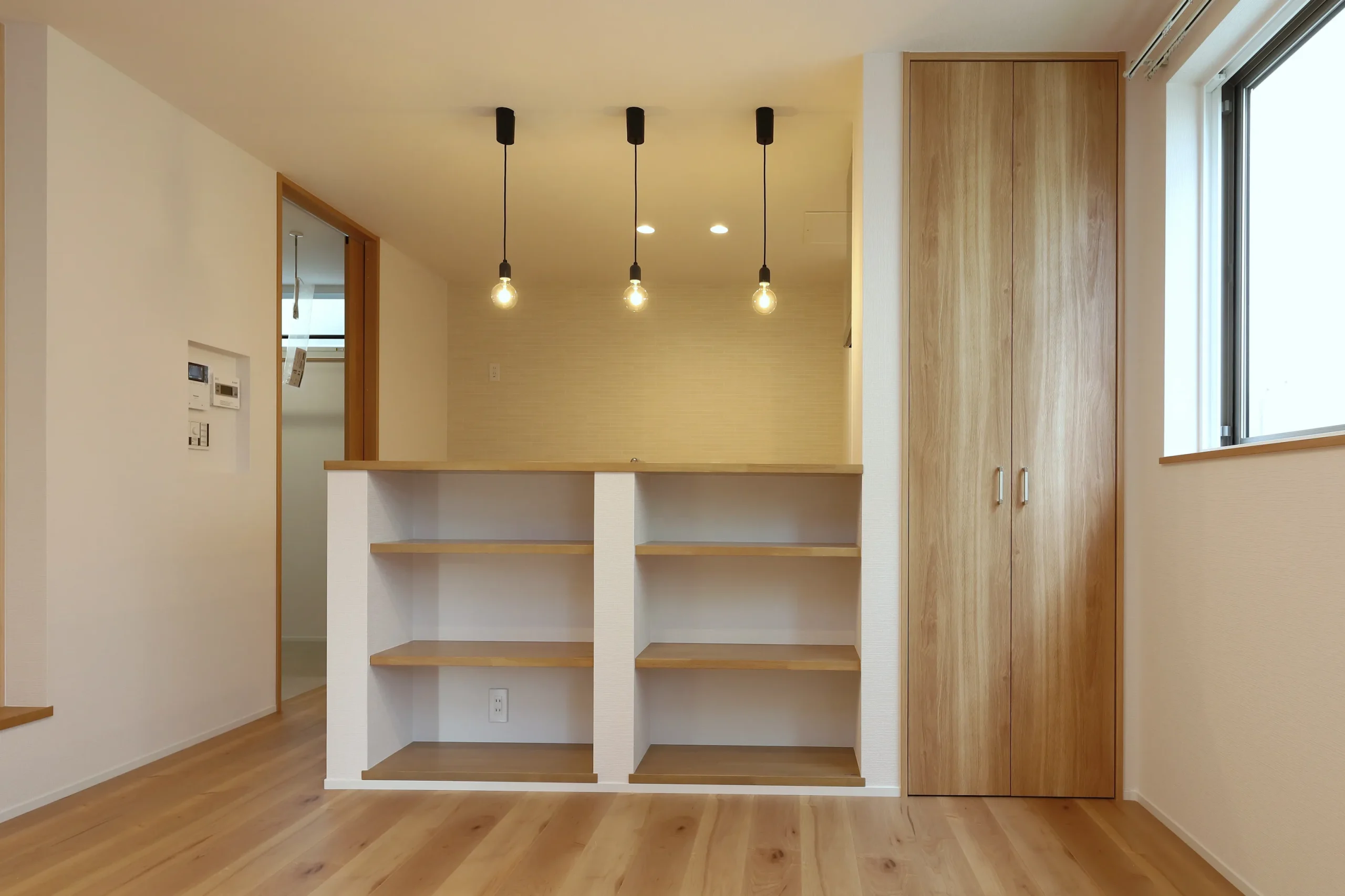 LDKは無垢材のやさしい風合いが広がる、温かな空間。アクセントとなる飾り棚や、角度によって金色に見える銀杏柄の