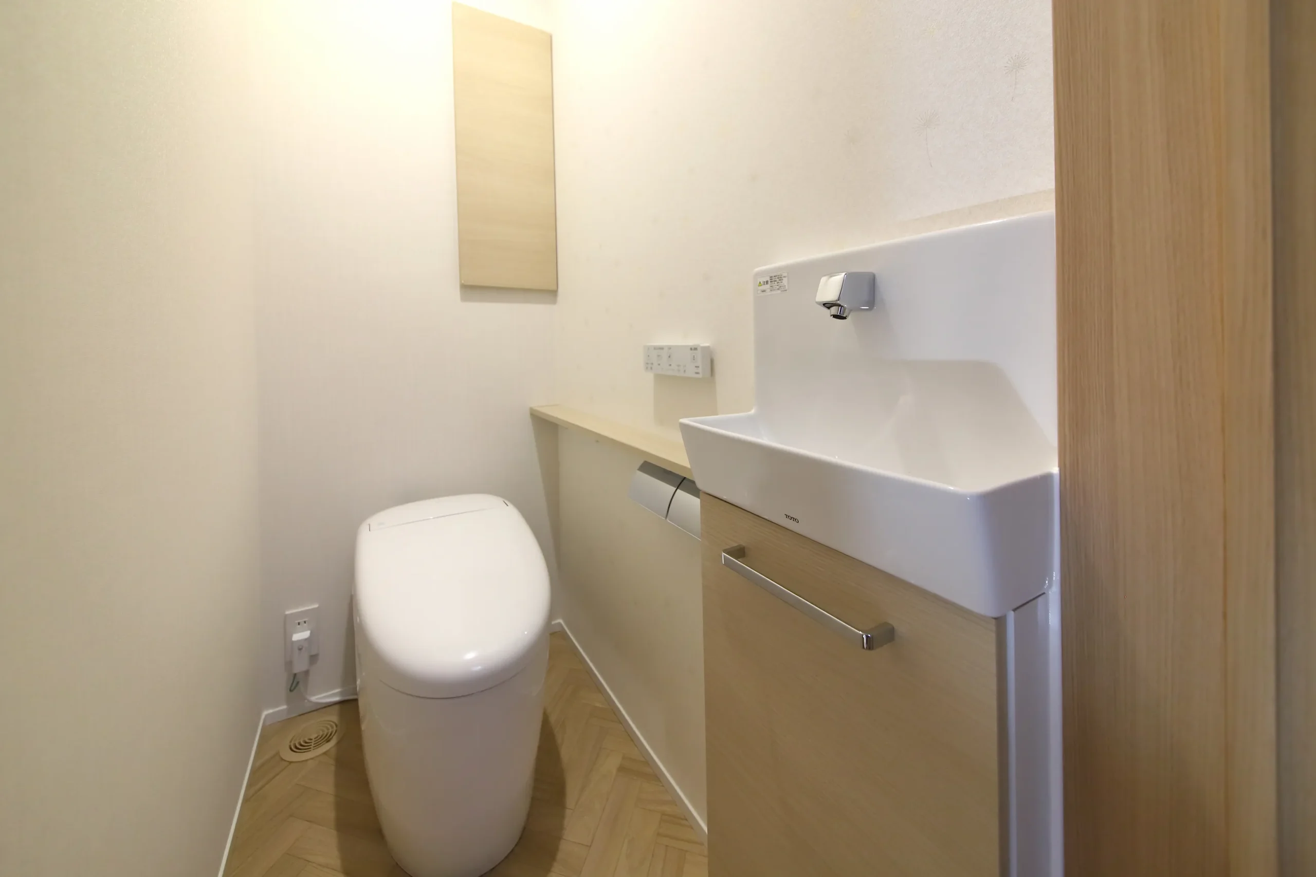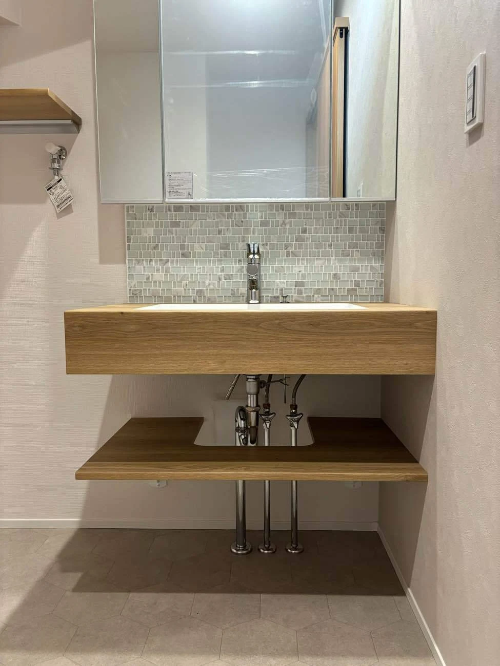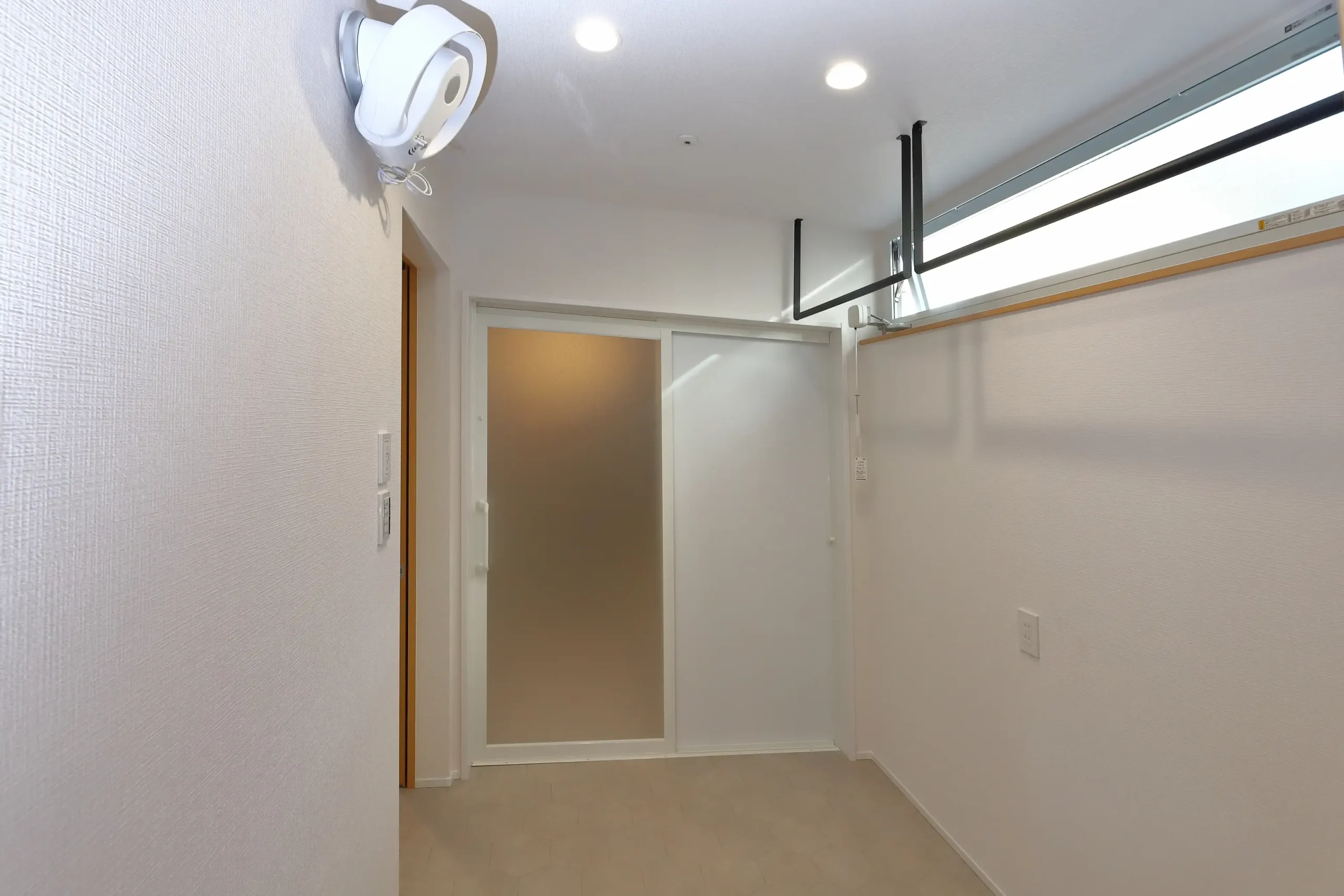 水まわりは、キッチンを中心に回遊できる家事ラク動線を計画。ランドリールーム、浴室(TOTOサザナ)、造作風洗面化粧台が隣り合い、天候に左右されない快適な家事環境が整いました。