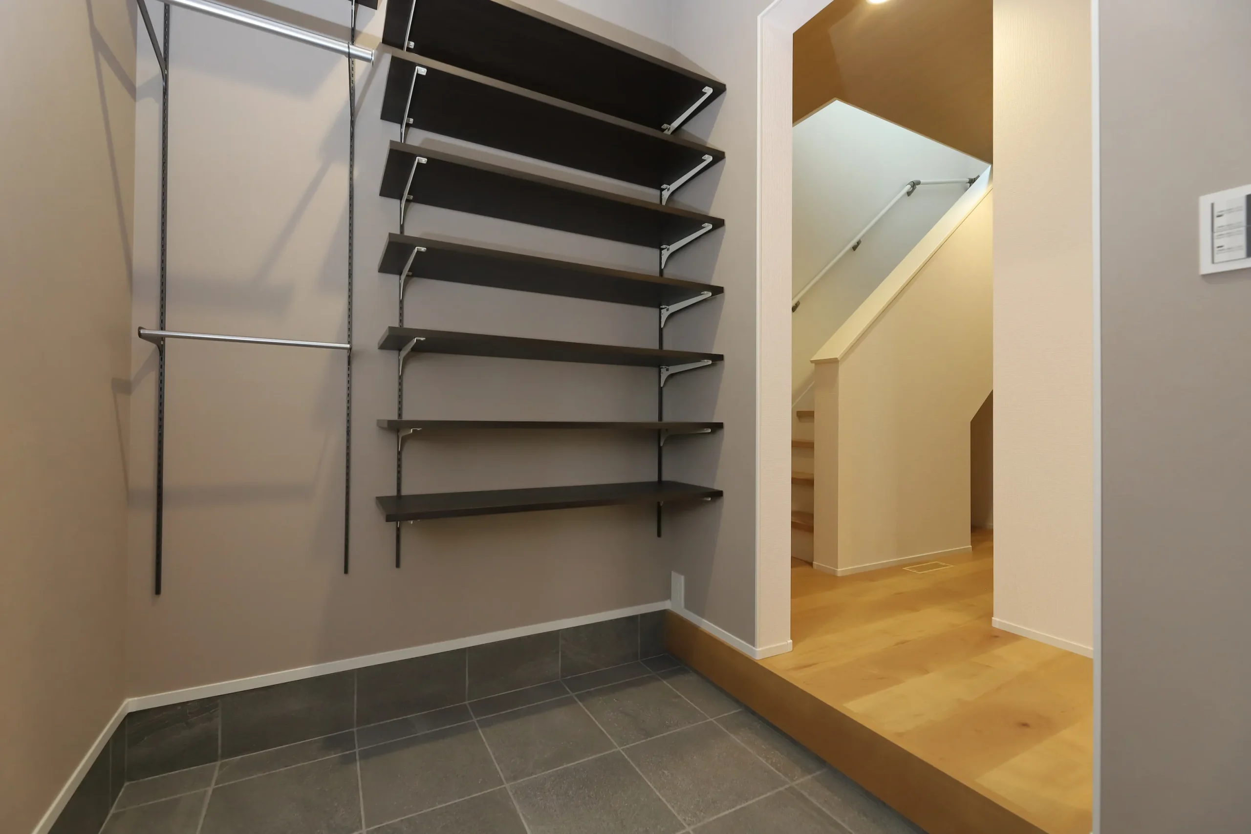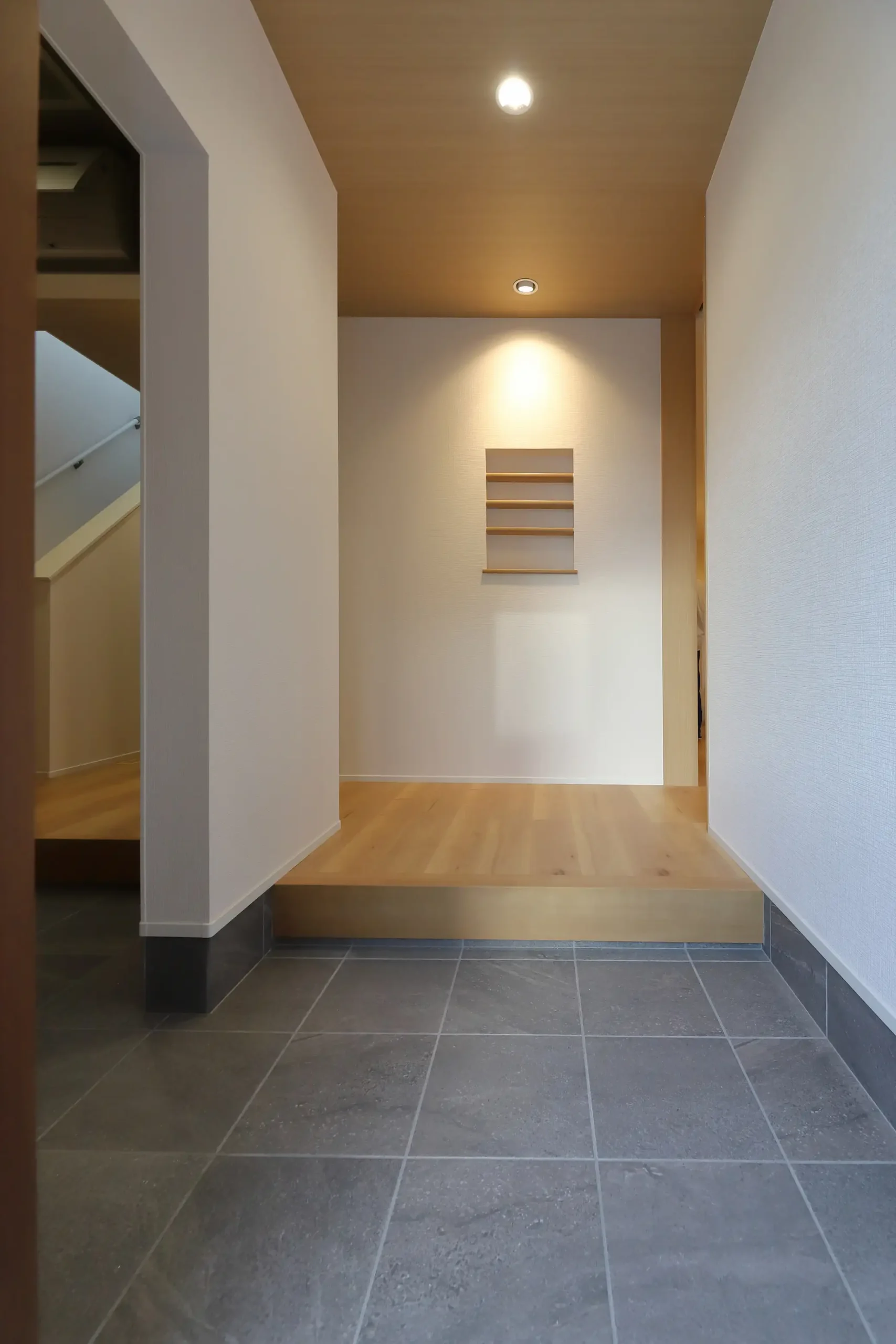 玄関は白い壁とナチュラルな木目を基調に、少し濃い色の玄関ドアで全体を引き締めたデザイン。ドアを開けると、スポットライトに照らされたニッチがお客様を迎えます。左手にはご家族用の動線を設け、ベビーカーの出し入れもしやすい工夫を施しました。