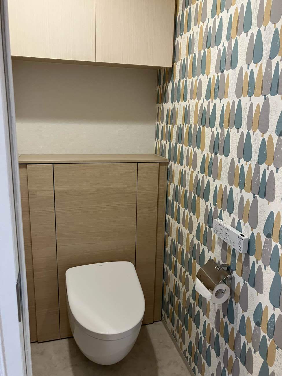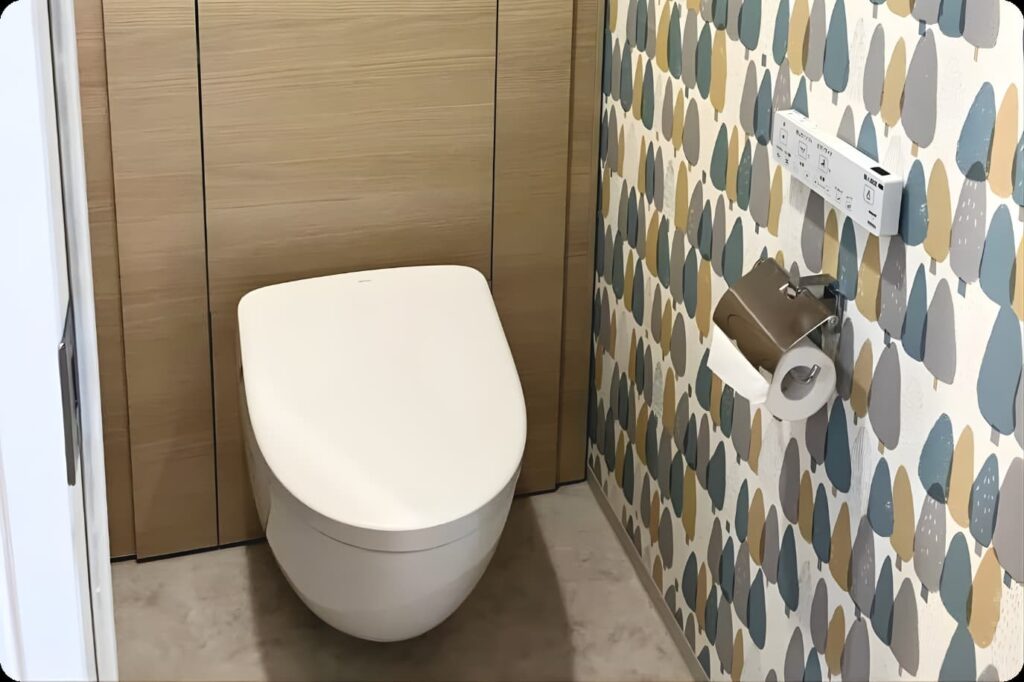 あわせて、森林を思わせるアクセントクロスを取り入れ、毎日使う場所だからこそ、心が落ち着くトイレ空間を実現しています。